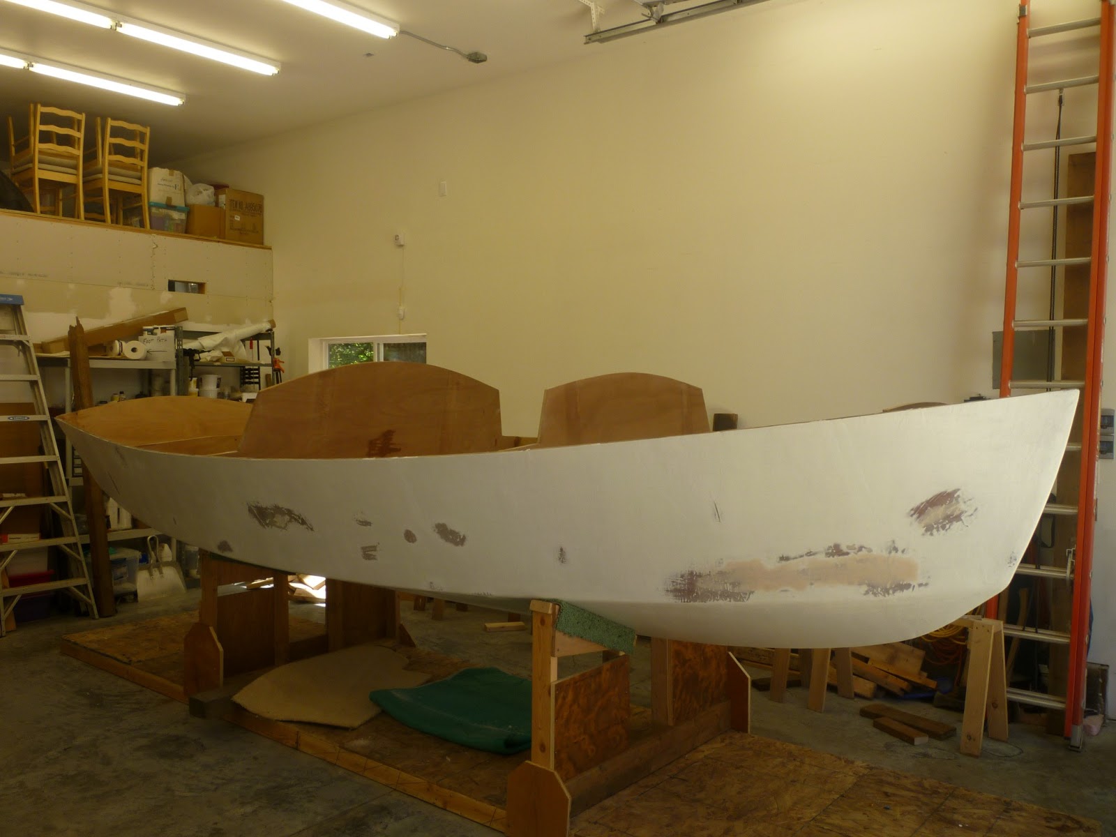 4) Finally, the whole thing is sanded. Epoxied. Sanded. Epoxied. Sanded. Faired. Sanded. Sheathed with fiberglass. Epoxied. Sanded. Epoxied. Faired. Sanded. Then you add the primer until the whole thing is a very respectable-looking white.